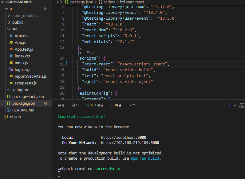 "start-react": "react-scripts start": npm run start-react 명령어를 사용하면