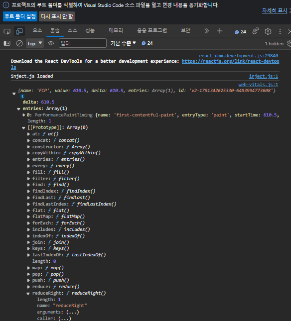 애플리케이션을 실행할 때 브라우저의 콘솔에 성능 지표가 출력됩니다.