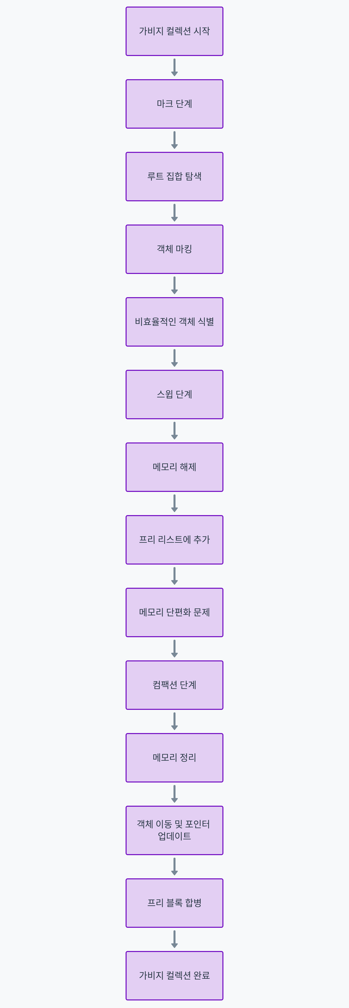 가비지 컬렉션의 전체 과정은 크게 세 단계로 나뉩니다: 마크, 스윕, 컴팩션. 이 과정은 다음과 같이 요약할 수 있습니다:
