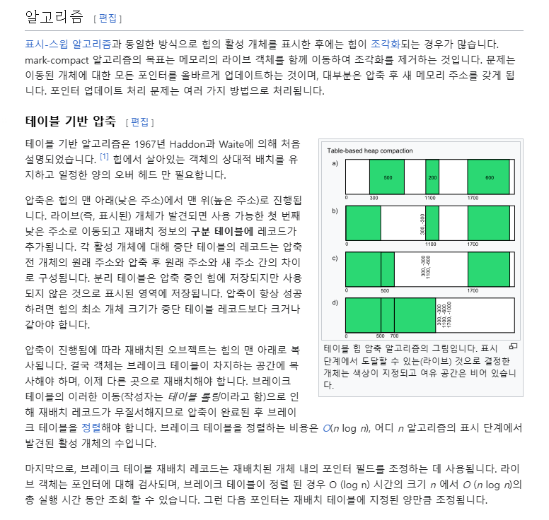 - 컴팩션(Compaction): 남아있는 객체를 메모리의 한쪽으로 이동시켜 메모리 단편화를 방지.