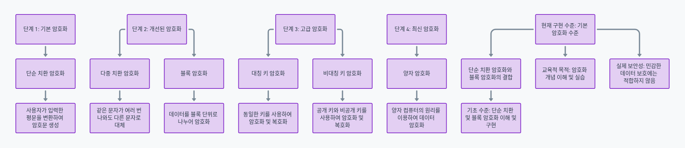현재 구현된 암호화 방식은 기본적인 단순 치환 암호화입니다. 이는 각 문자를 특정 규칙에 따라 다른 문자로 대체하는 방식입니다. 향후 다중 치환 암호화, 블록 암호화, 대칭 키 암호화, 비대칭 키 암호화, 양자 암호화 등의 고급 암호화 기법 도입이 필요합니다.