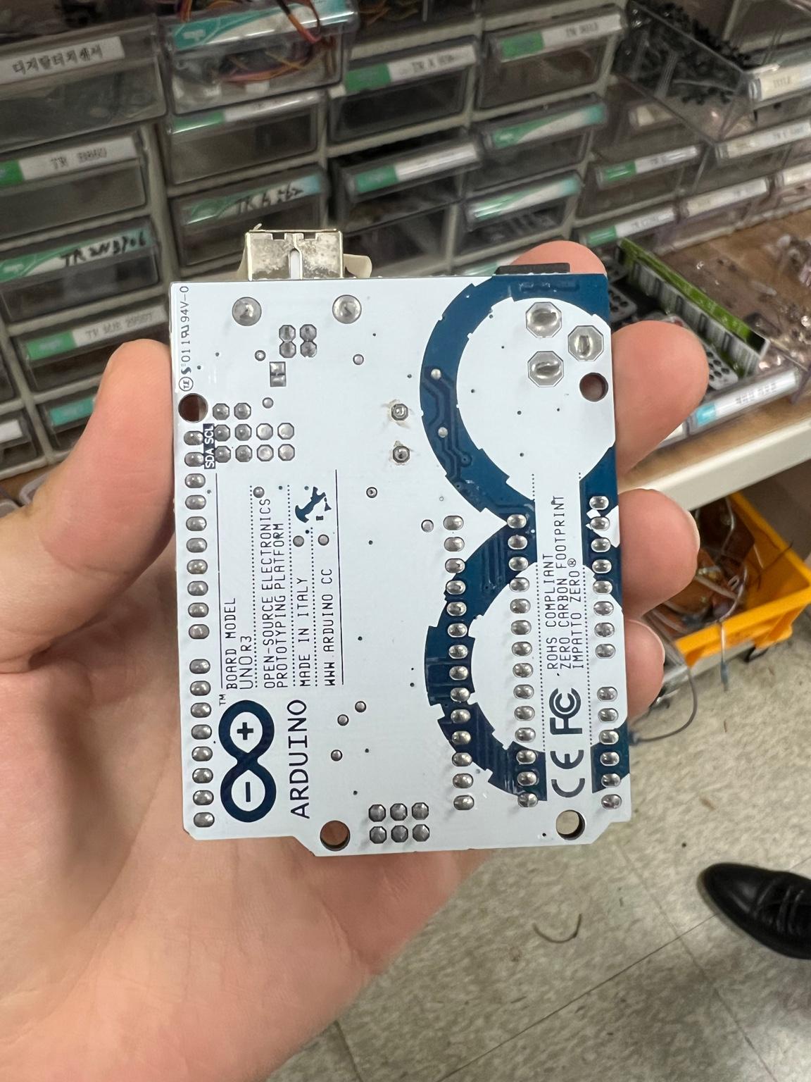 - Arduino UNO 보드임을 나타내며, CE 및 FCC 인증 마크가 표시되어 있습니다.