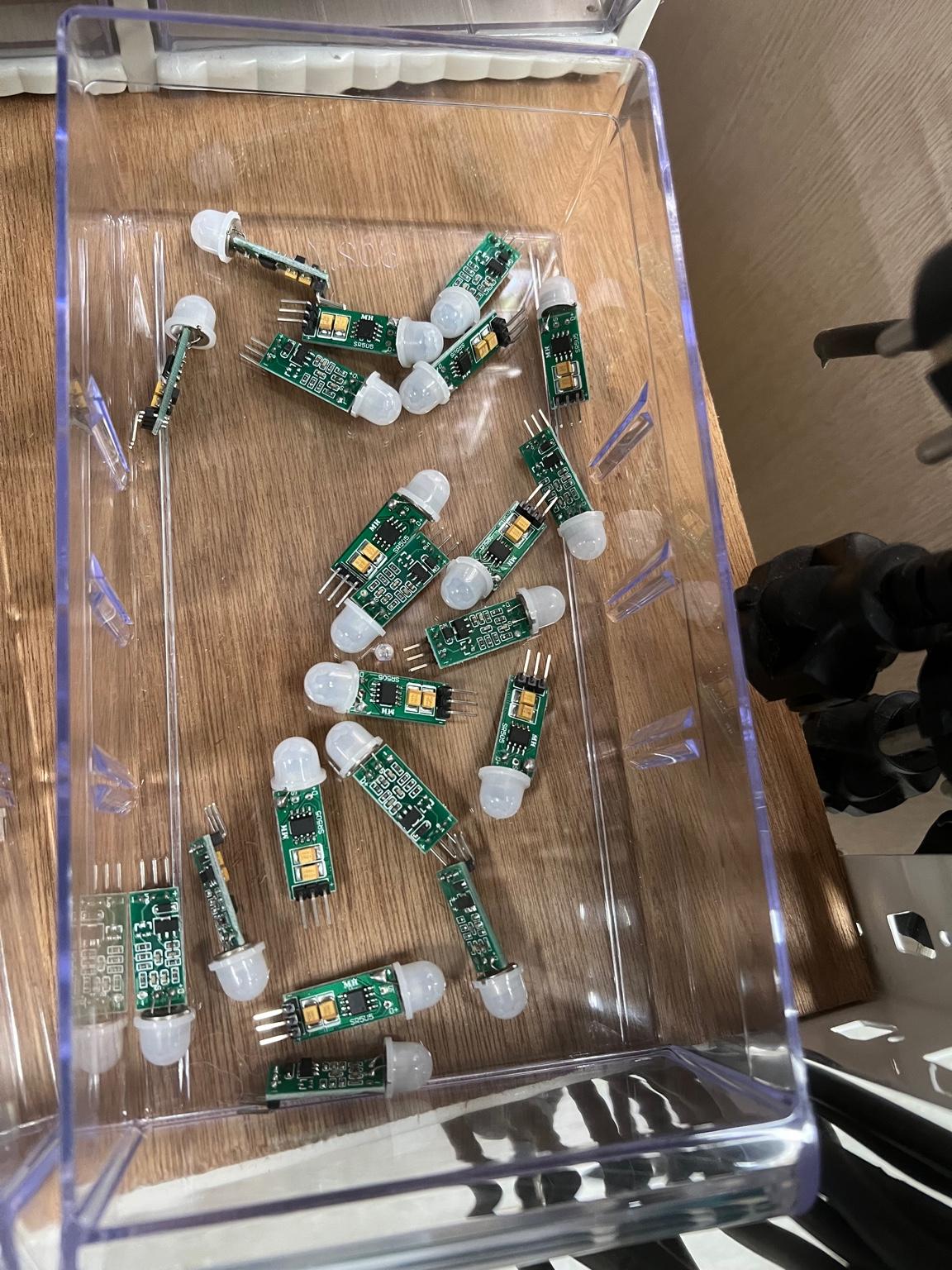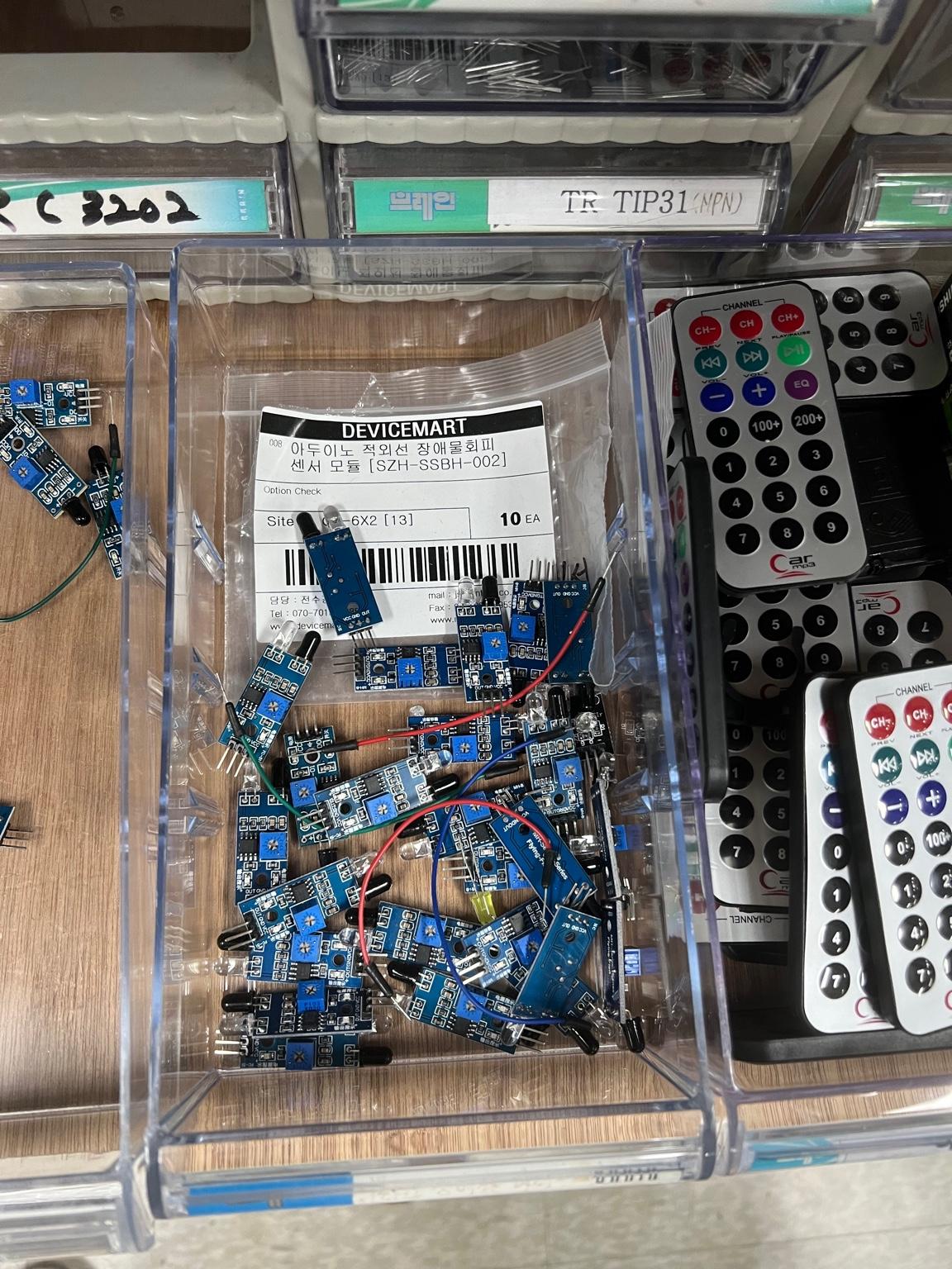 사진 중앙의 투명한 상자 안에 있는 모듈들은 '아두이노 적외선 장애물 회피 센서 모듈'로 보입니다. 이 모듈들은 다음과 같은 특징을 가지고 있습니다: