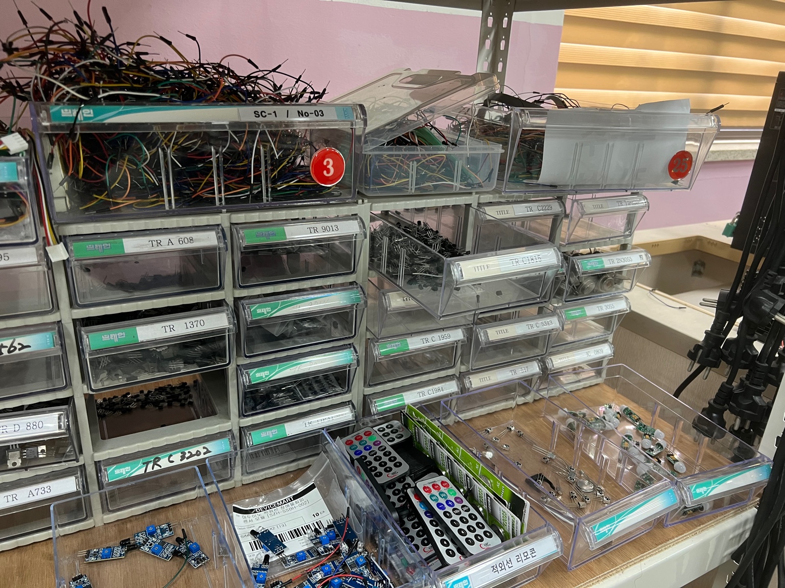 - 사진에 많이 보이는 3개의 핀을 가진 검은색 부품들은 적외선 수신 모듈입니다.