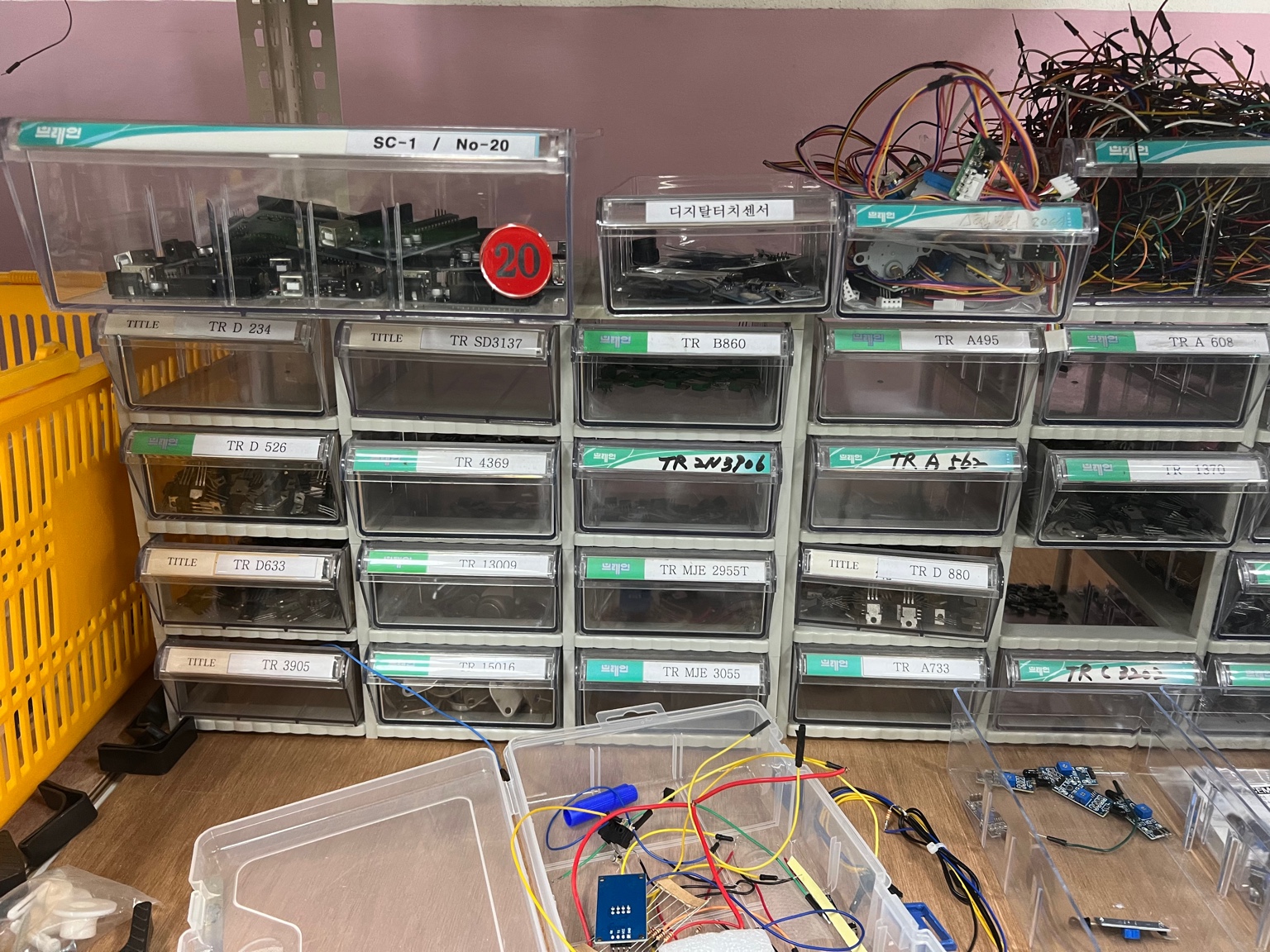 - 상단 오른쪽 상자에 다양한 색상의 점퍼 와이어가 많이 있습니다.