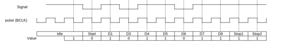 - 용도: 현대 시스템에서는 긴 "스페이스" 레벨을 의도적으로 사용하여 주의 신호로 보내거나, 신호 속도를 변경하라는 요청으로 사용할 수 있습니다. 예를 들어, DMX512 프로토콜에서 새 패킷의 시작을 알리는 데 사용됩니다.